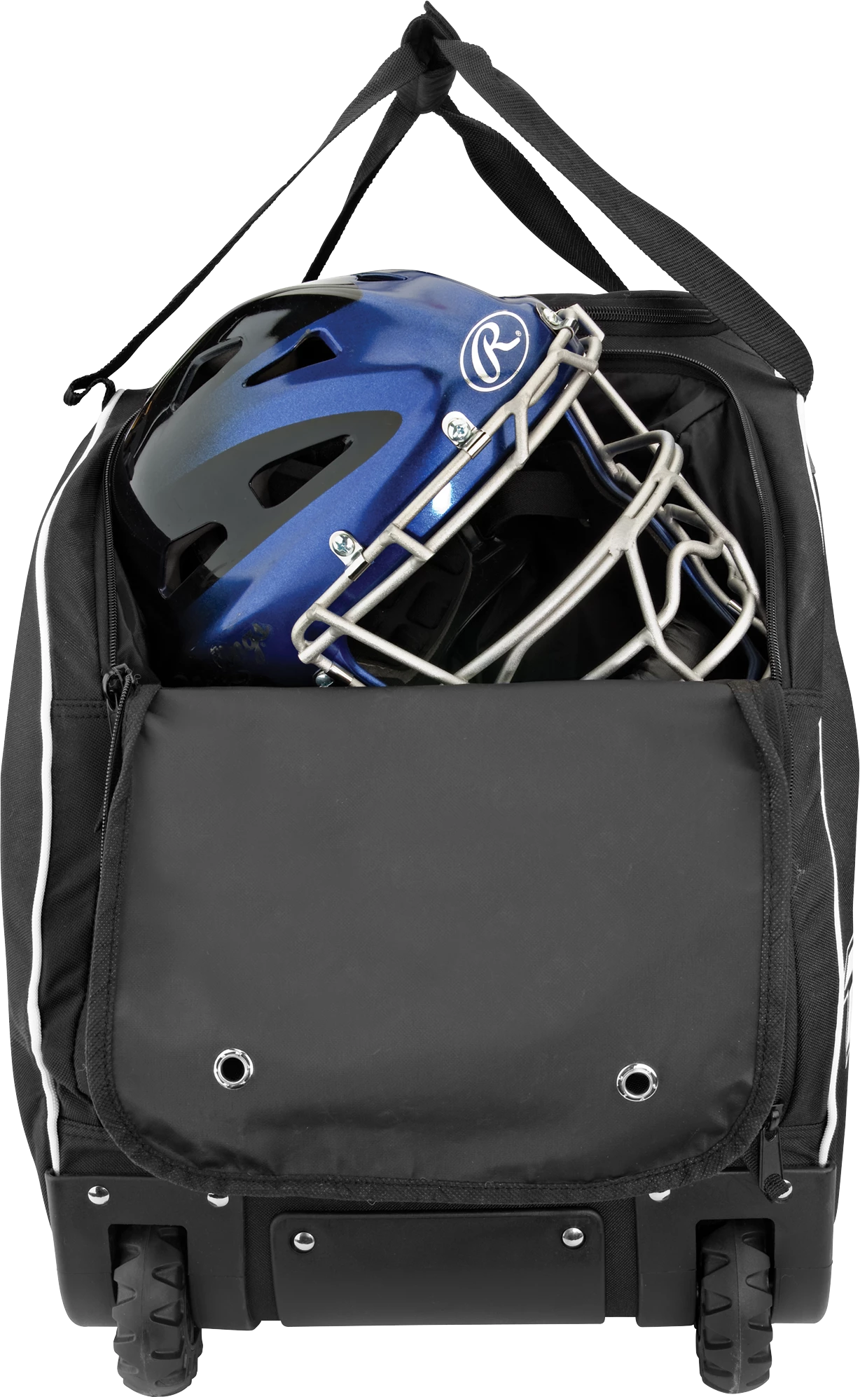 This equipment bag holds up to 6 bats and has a extra large main compartment which makes it the perfect bag for a catcher. The “Workhorse” also features Unstoppable B3 Monster Wheels to make pulling the bag easy and a Velcro closed strap for carrying. Other features include: a leg guard, catchers mask, and chest protector compartment.